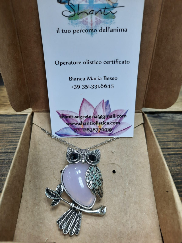 Amuleto donna con ciondolo civetta, per il riequilibrio emotivo: quarzo rosa.