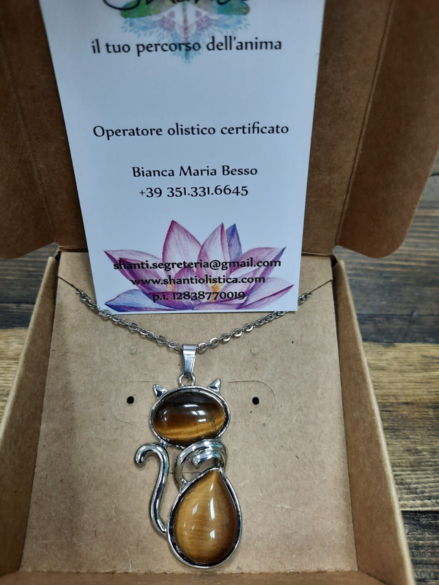 Amuleto donna con ciondolo a forma di gattino, adatto a ritrovare e riequilibrare il proprio potere personale: occhio di tigre