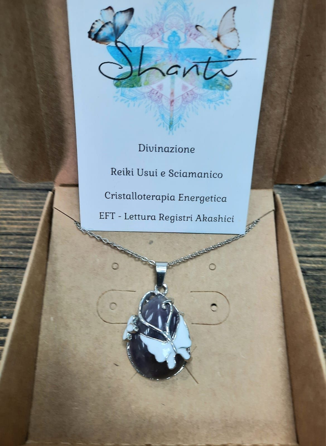 Amuleto donna con cristallo naturale di ametista, adatto per il riequilibrio emotivo. Cristallo a goccia su montatura in acciaio inossidabile con farfalla bianca smaltata e catenina in acciaio inossidabile.