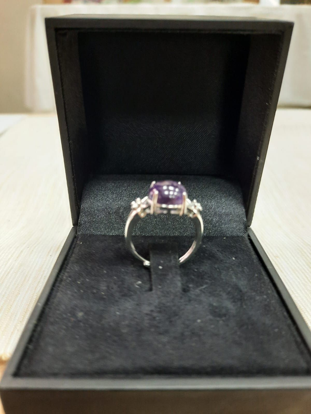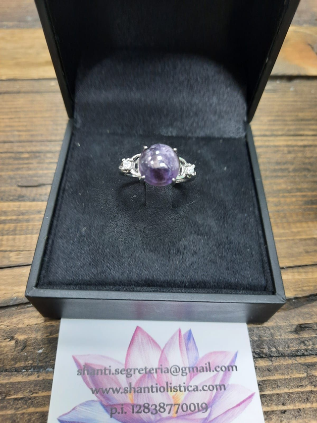 Anello donna in argento 925 placcato oro bianco, con cristallo naturale tondo di ametista. Questo cristallo è indicato per armonizzare stress, nervosismo e insonnia.