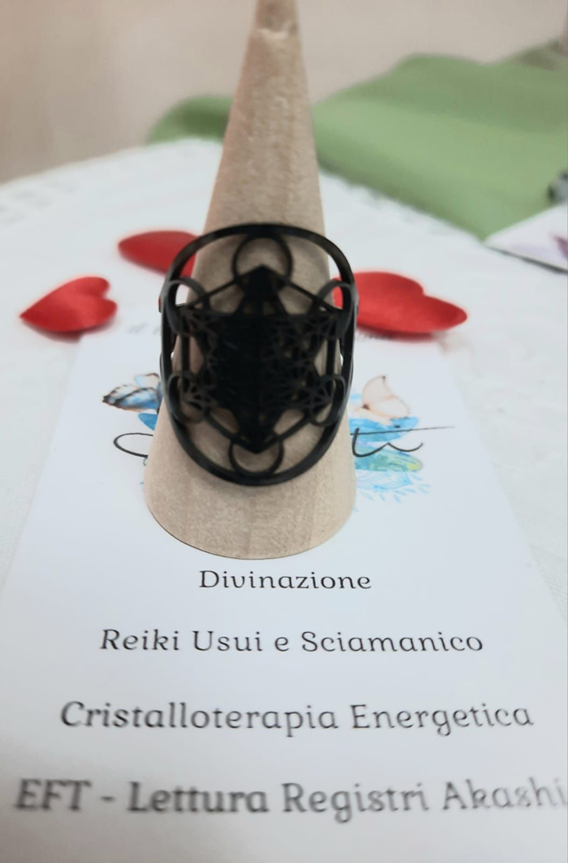 Anello unisex in acciaio inossidabile, regolabile e disponibile nelle varianti acciaio e nero. Simbolo della geometria sacra "Cubo di Metatron" che rappresenta l'unione dell'universo femminile (sfere e triangoli) con l'universo maschile (linee rette).