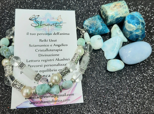 Bracciale donna con larimar e cristalli naturali di forme casuali. Questi cristalli promuovono la connessione con la propria parte emotiva e agevolano l'empatia, dissolvendo le paure inconsce.