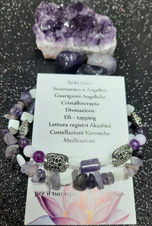 Bracciale donna con ametiste e cristalli naturali di forme irregolari. Questi cristalli aiutano a riequilibrare ansia, stress e a regolare le fasi del sonno.