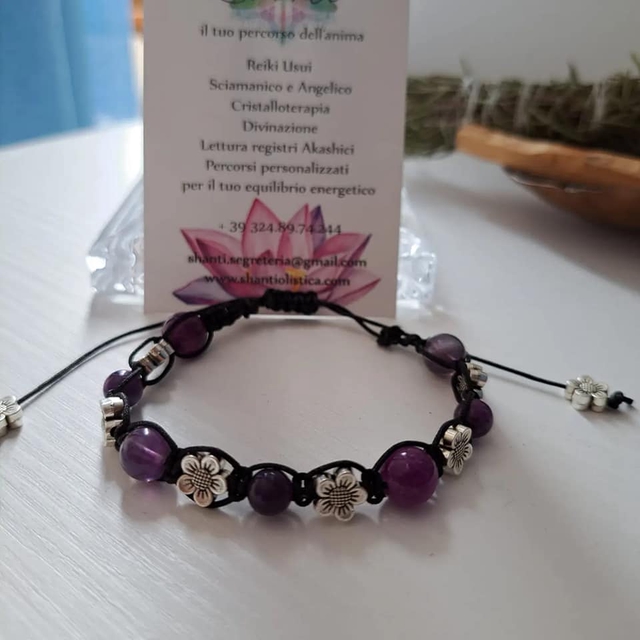 Bracciale donna con cristalli naturali di ametista per alleviare lo stress e la tensione, equilibra inoltre gli sbalzi d'umore. La montatura è in macramè con nodo scorsoio per adattarlo a qualsiasi tipo di polso.