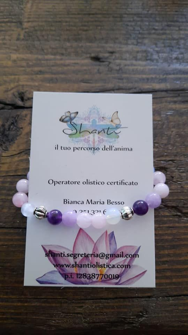 Bracciale donna con cristalli naturali di ametista, ametista lavanda, tormalina rosa e quarzo rosa. Adatto per ridurre stress, nervosismo e insonnia. Montatura con filo elastico.