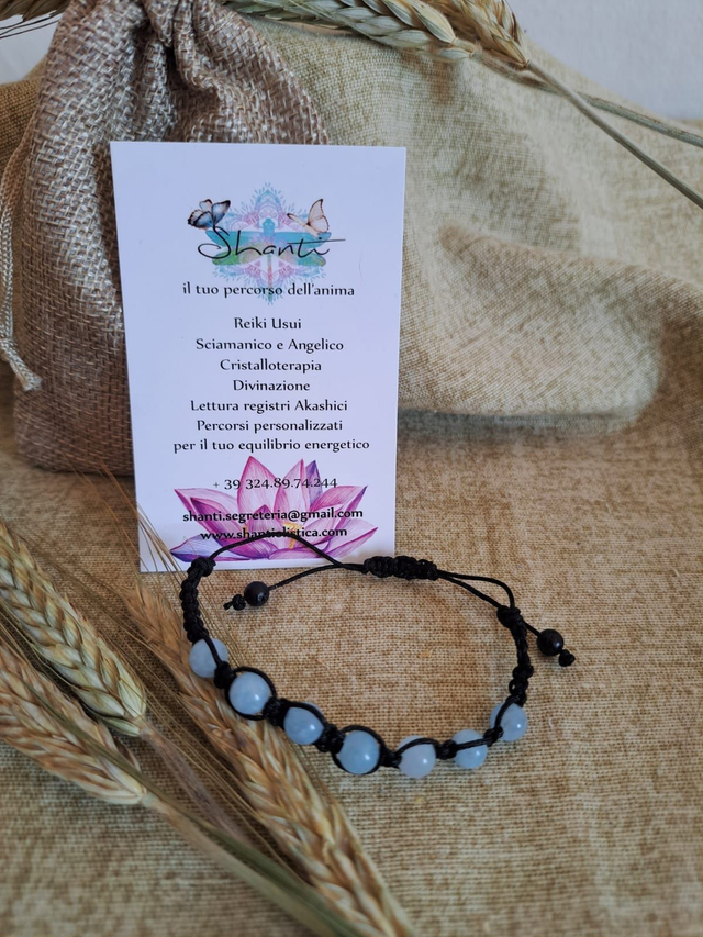 Bracciale con cristalli naturali di angelite, adatta a riconnettersi con le proprie guide angeliche. Montatura in macramè con nodo scorsoio che permette di adattarlo a qualsiasi polso.