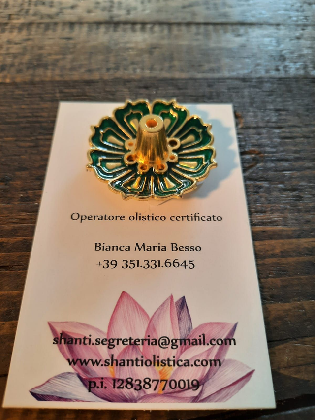 Bruciatore per incenso a bastoncini in metallo smaltato verde, a forma di fiore di loto. Diametro circa 2 cm.