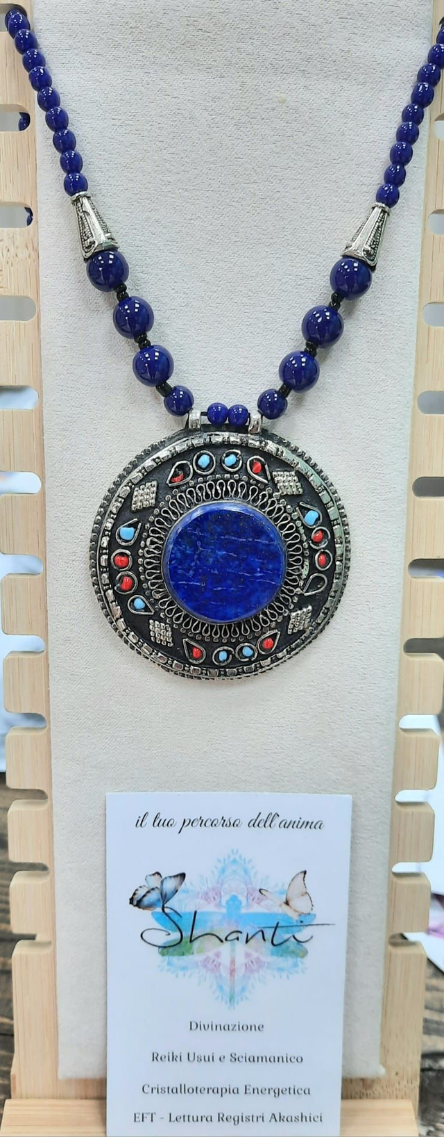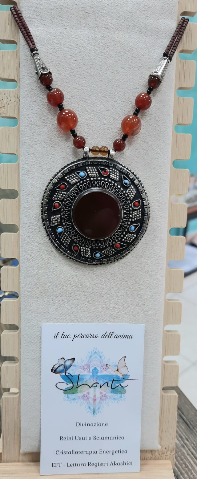 Collana di manifattura artigianale indiana, con cristalli naturali di corniola (adatta al riequilibrio dei rapporti familiari), lapislazzuli (per il riequilibrio della comunicazione, corallo rosso (per il radicamento). Medaglione in acciaio anticato con punzonatura etnica, diametro circa 5 cm.