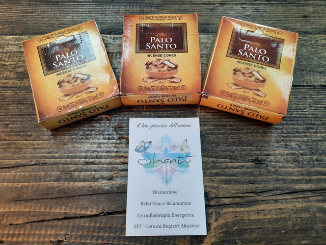 Incenso in conetti di palo santo, circa 8 conetti a confezione. Il palo santo è noto agli europei da almeno due secoli, soprattutto per l’estrazione del suo pregiato olio essenziale. E' originario dell'America centro-meridionale dove cresce spontaneamente fino al confine tra Perù e Bolivia.