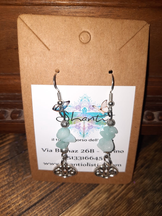 Orecchini donna con chips di cristalli naturali di angelite, adatti per chi desideri riconnettersi alle proprie guide spirituali. Montatura in acciaio inossidabile.