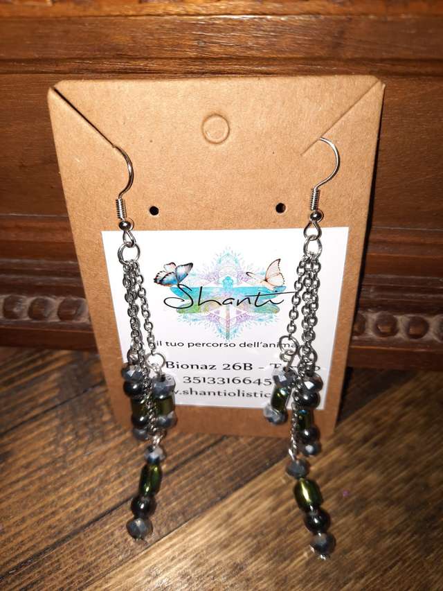 Orecchini donna con cristalli naturali di ematite verde e perle bijoux. L'ematite è un cristallo adatto per la protezione dalle negatività. Montatura in acciaio inossidabile.