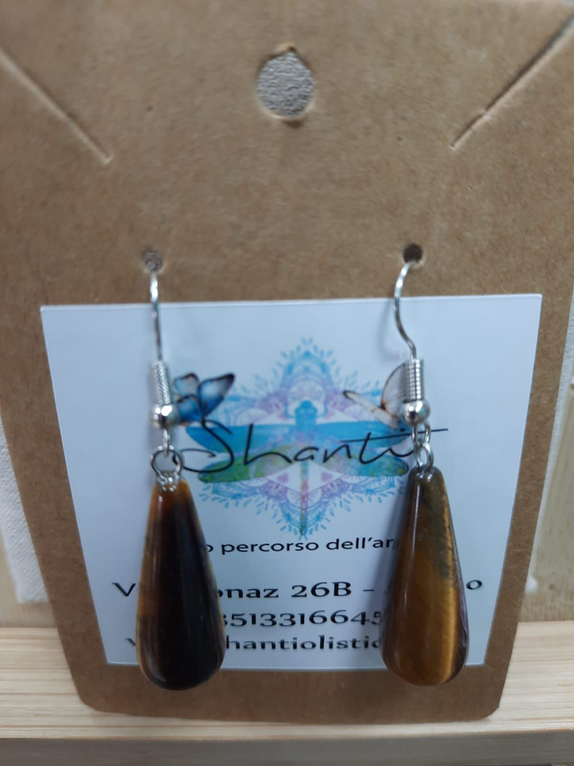Orecchini donna con pendente a goccia in cristallo naturale di occhio di tigre. Questo cristallo ti aiuterà a manifestare il tuo potere personale. Montatura in acciaio inossidabile.