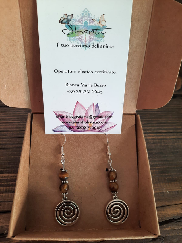 Orecchini donna con ciondolo a spirale e cristalli naturali di occhio di tigre, indicati per la riconnessione al proprio potere personale. Montatura e ciondolo in acciaio inossidabile.