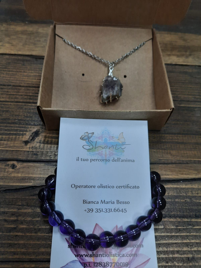 Parure donna composta da amuleto con piccola drusa di ametista con montatura a ragno (acciaio inossidabile) e bracciale in ametista, adatto al riequilibrio di stress e nervosismo.