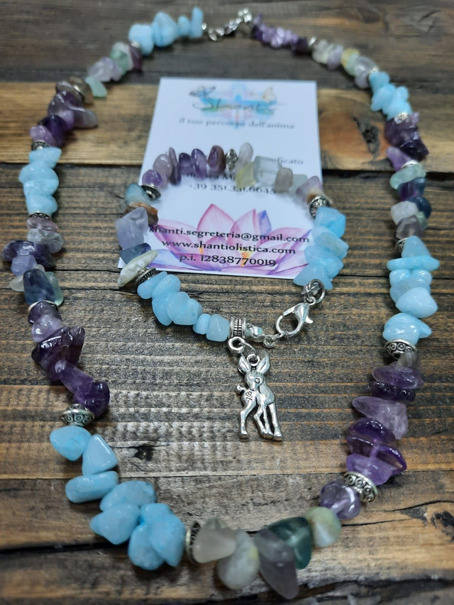 Parure donna composta da collana e bracciale in chips di cristalli naturali di ametista, fluorite e angelite, indicati per il riequilibrio emotivo: ametista, fluorite e angelite. Montature con gancio.