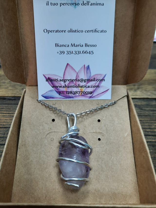 Amuleto donna con cristallo naturale di ametista, adatto per per contrastare ansia, stress, paure e insonnia. Montatura del cristallo a spirale e catenina in acciaio inossidabile.