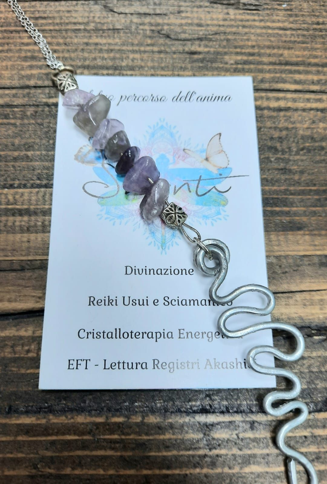 Amuleto donna con chips di cristallo naturale di ametista, adatto per il riequilibrio emotivo. Cristallo su montatura in acciaio inossidabile con ciondolo in lega di metallo battuto a mano.