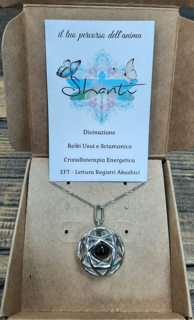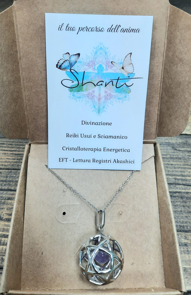 Amuleto donna in acciaio inossidabile con ciondolo pentasfera con cristallo naturale. La pentasfera ha la capacità, se correttamente utilizzata, di amplificare le facoltà extrasensoriali e può purificare l’ambiente in cui è posta. E' uno strumento potente ed è un ottava superiore alla Genesa poiché agisce nel mondo astrale anziché in quello fisico ed eterico.